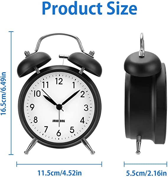 Description: It is this twin bell alarm clock features that have two bell-like top decorations that give you a loud wake-up call, which is perfect for heavy sleepers, mild hearing loss people or even the deaf. This twin bell alarm clock has big numeral moment on its surface for easy reading, and it operates without clicking, providing a good environment for you to sleep in. The alarm clock is made of metal, which is durable and eco-friendly. The length of the product is 11.5cm, the width is 5.5cm, and the height is 16.5cm. It is suitable for public places, living room, office, study, bedroom and kitchen.